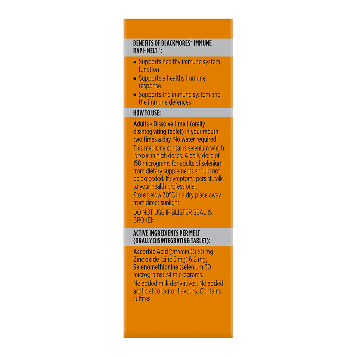 Blackmores Immune Rapi-Melt contains vitamin C, zinc and selenium which helps to support the immune system to fight illness and helps to stimulate a healthy immune system response.